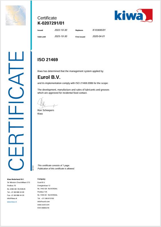 Eurol đã đạt được chứng chỉ ISO 21469:2006. Với chứng chỉ này, Eurol chứng minh rằng công ty đáp ứng được tiêu chuẩn được công nhận quốc tế về yêu cầu vệ sinh đối với dầu và chất bôi trơn có tiếp xúc ngẫu nhiên với sản phẩm. Ngoài chứng chỉ này, Eurol còn có chứng chỉ quản lý môi trường 14001:2015 và chứng chỉ quản lý chất lượng ISO 9001:2015.